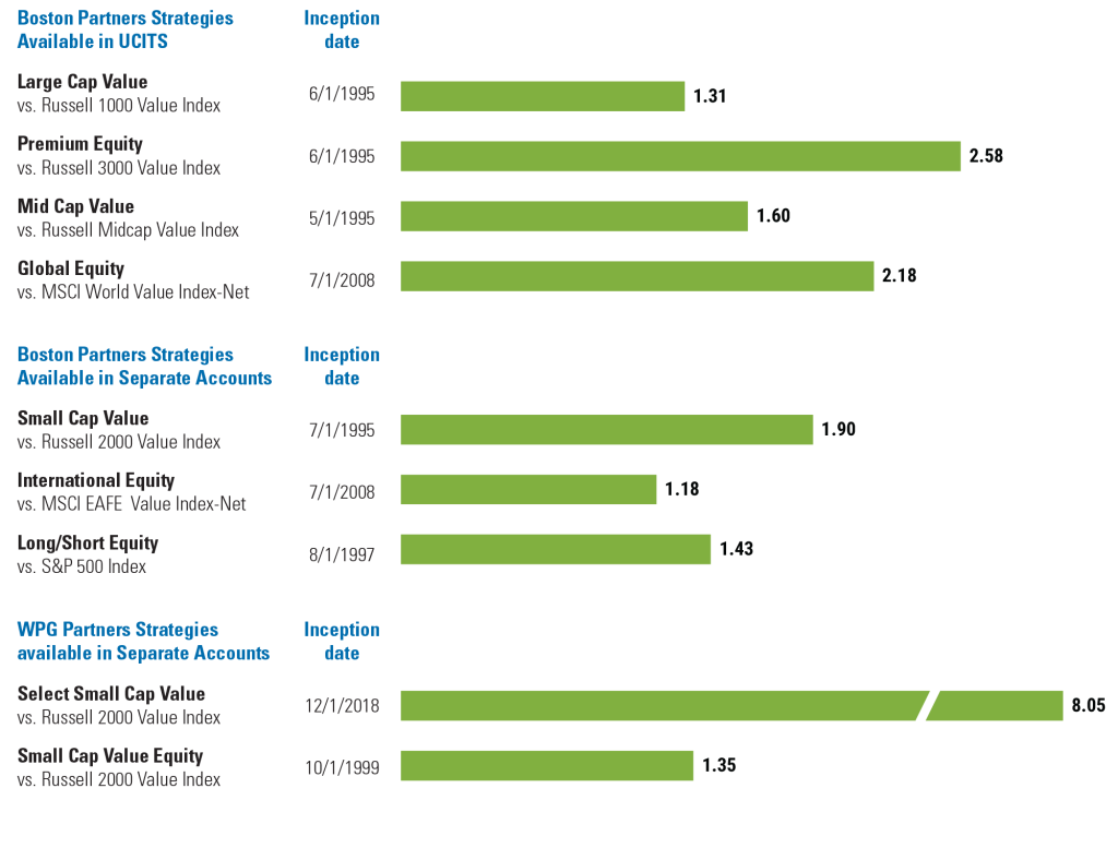 Data as of September 30, 2025. Source: Boston Partners. The green bars reflect the average annual excess return (net of fees) versus the indexes shown since each strategy’s inception. Past performance does not guarantee future results. It is not possible to invest directly in an index.